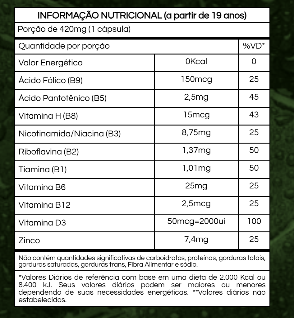 O nosso produto conta com vitaminas, minerais e hormônios responsáveis por proporcionar a melhora da sua saúde interna (imunidade, metabolismo, musculatura, sistema nervoso) como a externa (cabelos, unhas, pele).